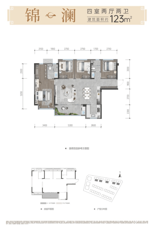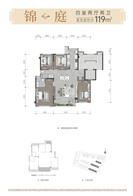此面积段户型是项目的主力改善产品,实现了四房两厅两卫的配置。在约119-123㎡的尺度内,保证了各功能空间的舒适性与独立性,既能满足二胎家庭或三代同堂的居住需求,也可将一间房灵活改造为书房或兴趣室,是追求功能完备与品质感的家庭升级之选。