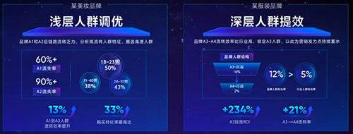 某服装品牌通过人群诊断发现A3(Ask)-A4(Act)流转效率比行业高,以此为营销发力点,锁定A3人群,挖掘购买特征和内容偏好定向转化。持续蓄水A3,最终带来A3到A4流转率提升21%、ROI最高提升234%的表现。
